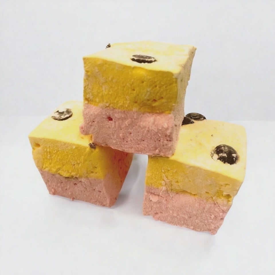Una sabrosa combinación de frambuesa y limón, enriquecida con trocitos de chocolate negro para darle un agradable crujido y un ligero sabor agridulce. Estos malvaviscos destacan por su textura suave y sus dos alegres colores: rosa y amarillo.